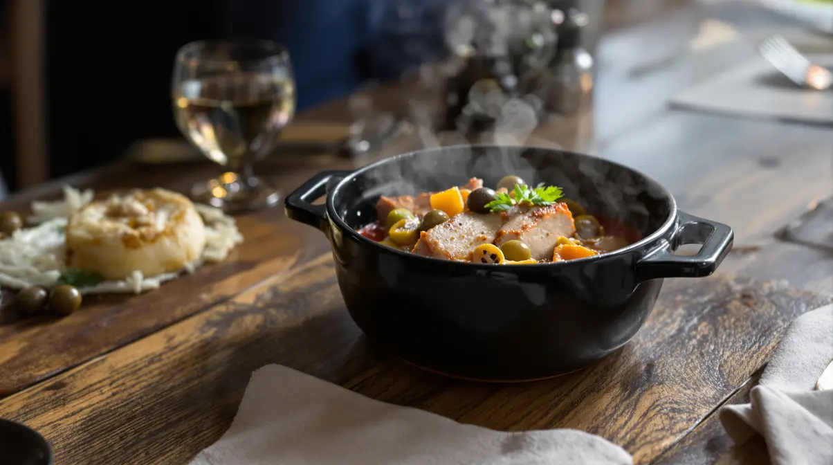La base est très simple. Une semoule cuite dans du lait, des œufs, un peu de fromage. Puis une sauce tomate maison très généreuse, avec poulet, champignons et olives vertes. Le tout gratine au four et arrive à table brûlant, dans de jolis pots individuels.